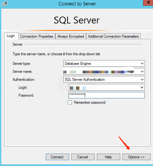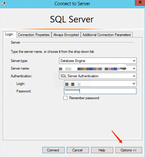 1. 打开 SQL Server Management Studio 客户端,单击对话框右下角的选项。