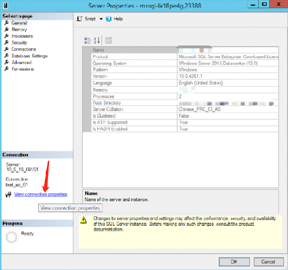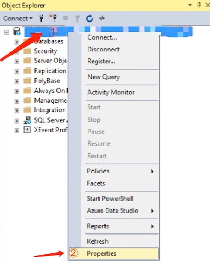 1. 通过 SSMS 成功连接登录后,在实例上右击选择属性。