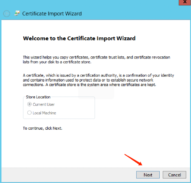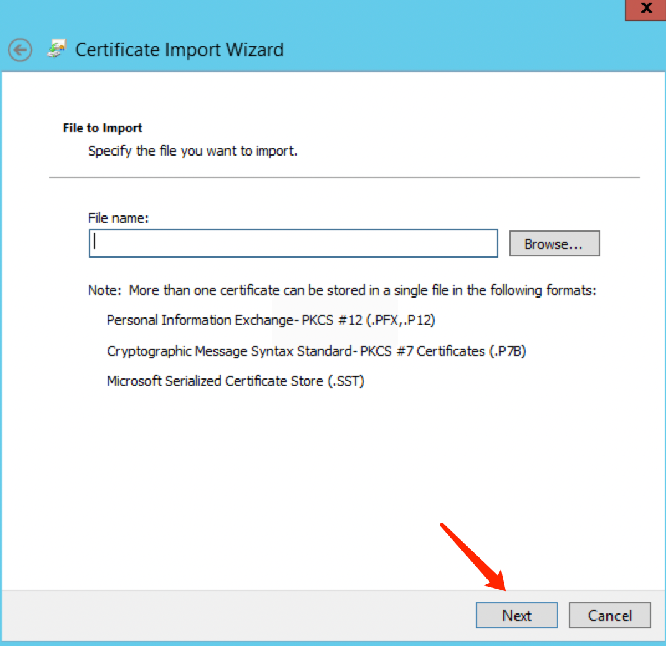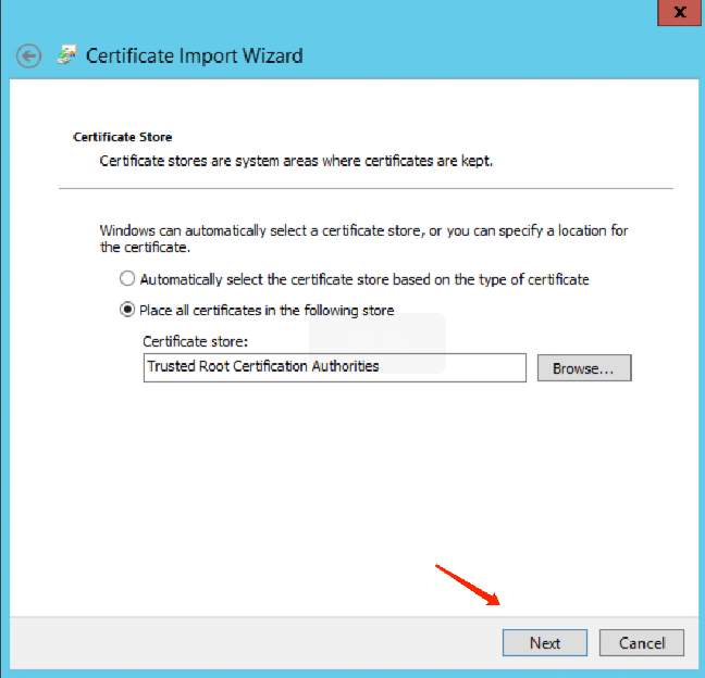 4. 在证书导入向导页面中,单击浏览导入已下载的 SSL CA 证书,并单击下一步。