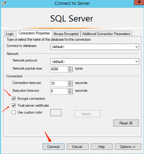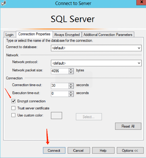 2. 在连接属性选项卡中,勾选加密连接和信任服务器证书,并单击连接。