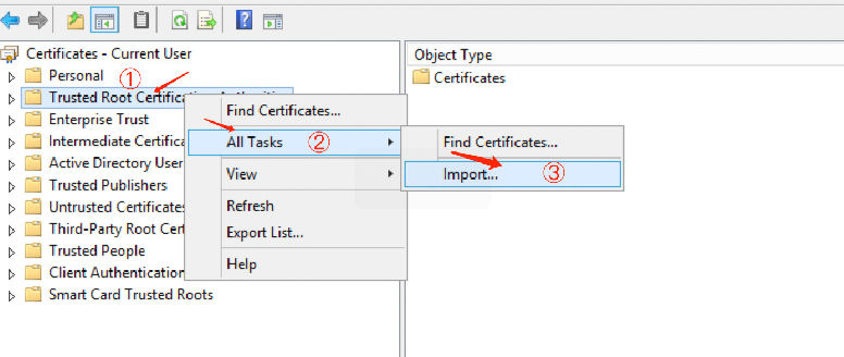 2. 在 certmgr 对话框中,鼠标右键单击受信任的根证书颁发机构,选择所有任务 > 导入。