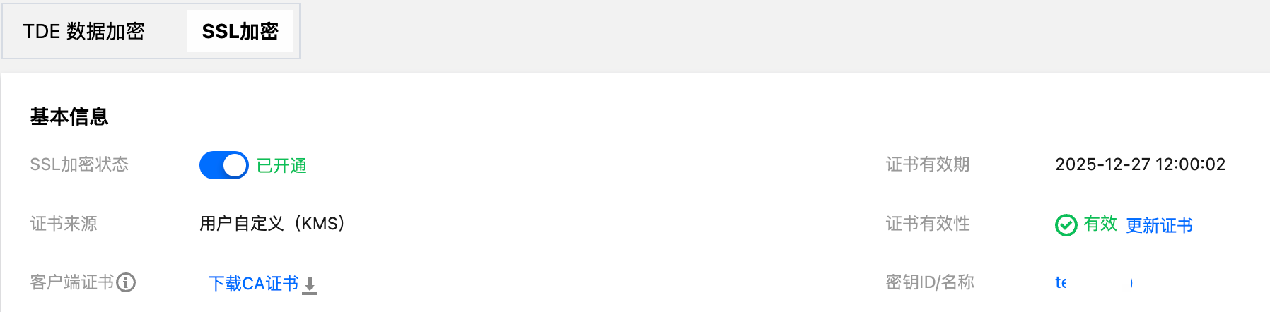 SSL 的证书具有有效期,证书来源为腾讯云时有效期为1年,证书来源为用户自定义时,有效期为您在 KMS 控制台创建的自定义密钥时所配置的日期。到期前您需手动更新证书,以确保使用 SSL 加密连接的客户端程序可以继续正常连接。