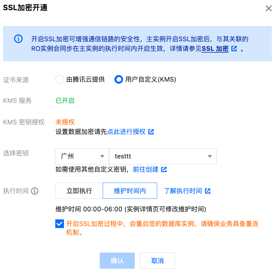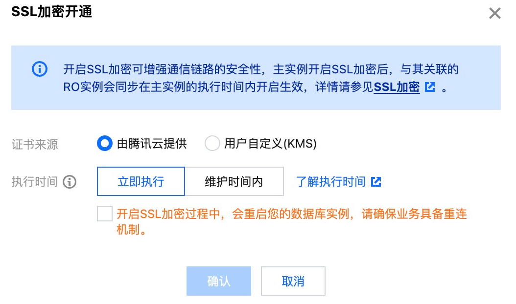 若没有可选的证书,或者已有证书不符合您的要求,您可单击 前往创建,到 KMS 控制台创建证书后,再返回选择新创建的证书。 4. 在弹窗下选择执行时间,勾选“开启 SSL 加密过程中,会重启您的数据库实例,请确保业务具备重连机制”,单击确定。
