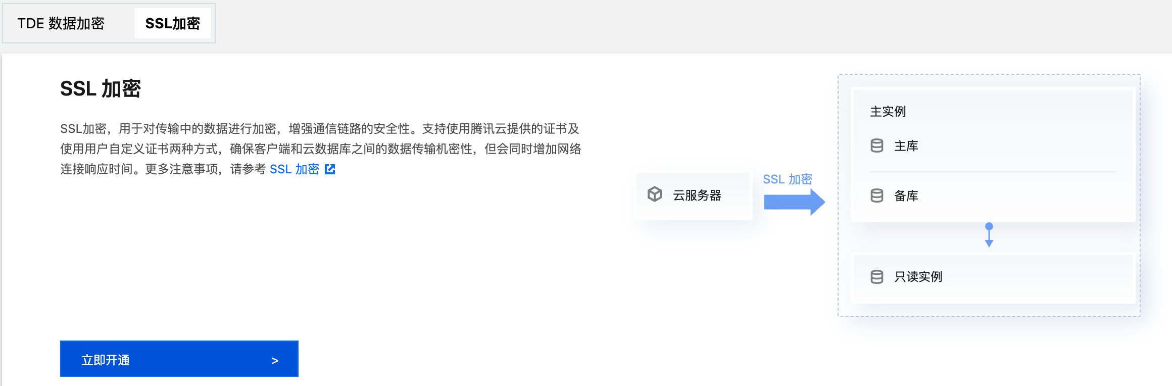 SSL 加密不保护数据本身,是确保来往于客户端和云数据库服务器端之间的流量安全,在传输层对网络连接进行加密,能够提升通信数据的安全性和完整性,但会同时增加网络连接响应时间。