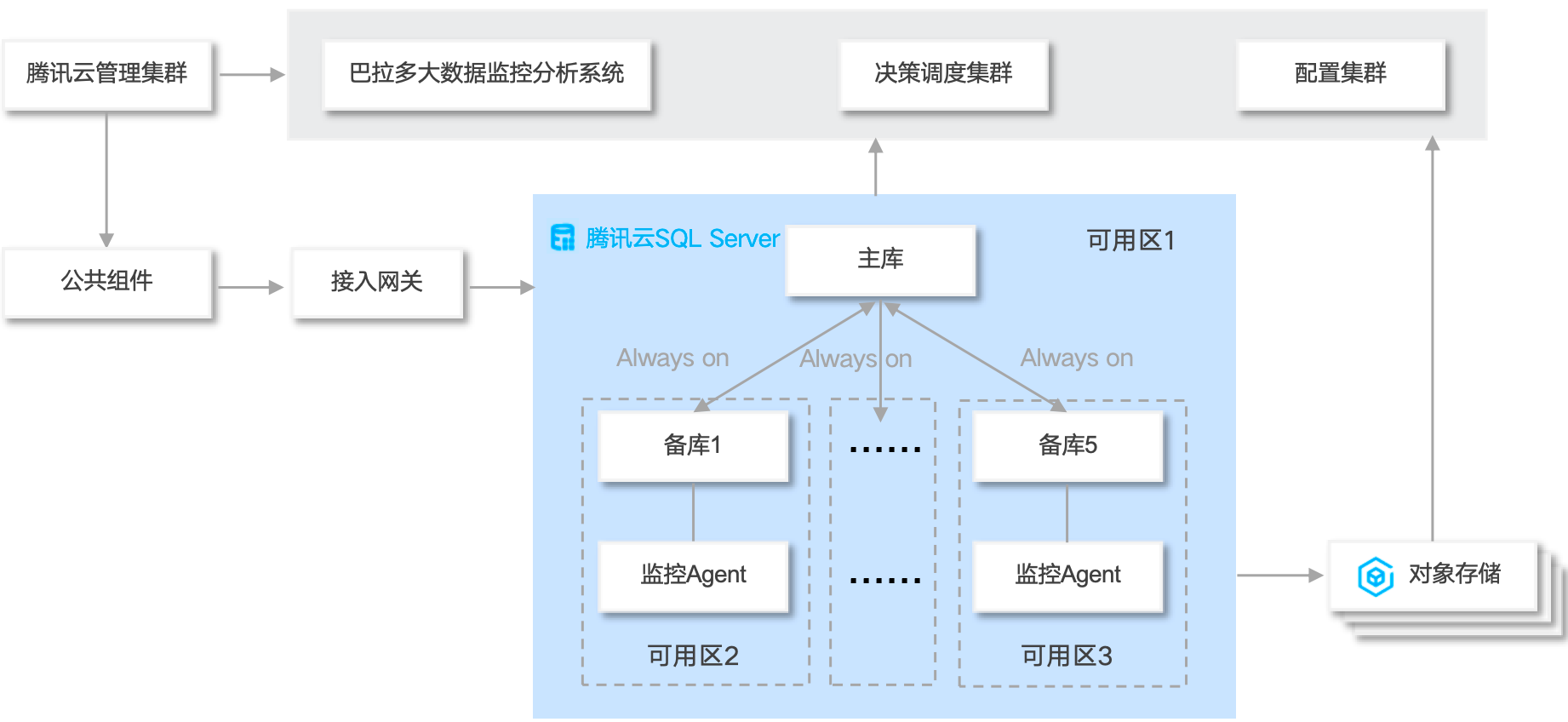 数据库采用一主多备的部署方式,能显著提升数据库的容灾能力,可以有效保障数据库的正常连续运行,以防数据库实例因出现故障要进行 HA 切换时,但由于备库所在可用区发生机房级别事故,而无其他备库进行切换引起的业务中断,恢复时间较长的问题。云数据库 SQL Server 为您提供一主多备的高可用容灾部署方式,根据业务实际情况和成本,您可以选择一主两备、一主三备,或最高一主五备,并将备库部署在不同的可用区,这样的架构使得业务生产环境更加有保障,能够抵御包括机房整体故障在内的多种意外情况。