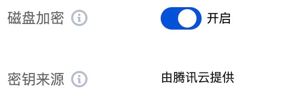 3. 打开磁盘加密后的按钮,密钥来源默认为由腾讯云提供。