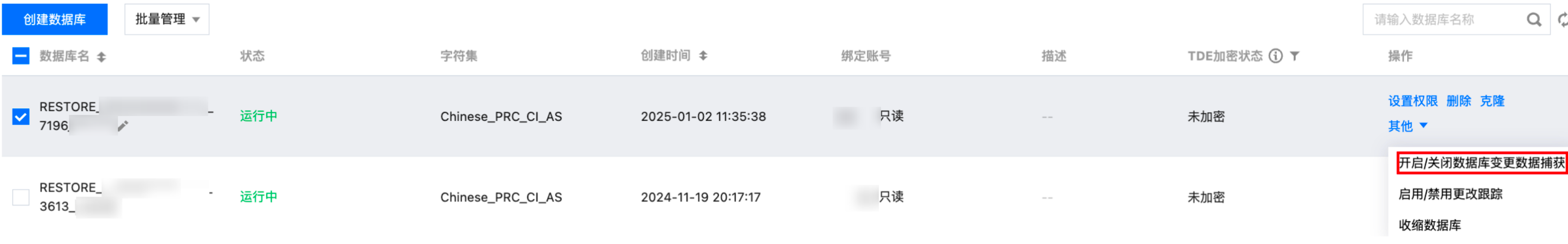 2. 在实例管理页面,选择数据库管理页,选择目标数据库所在行,在操作列选择其他 > 开启/关闭变更数据捕获。