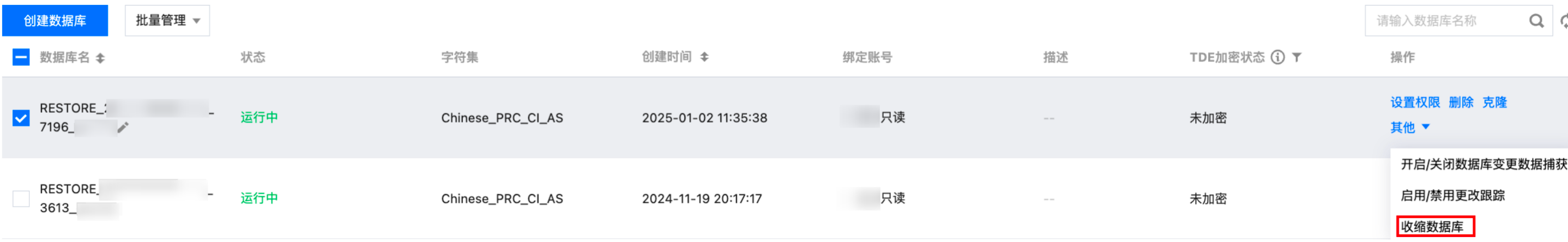 2. 在实例管理页面,选择数据库管理页,选择目标数据库所在行,在操作列选择其他 > 收缩数据库。
