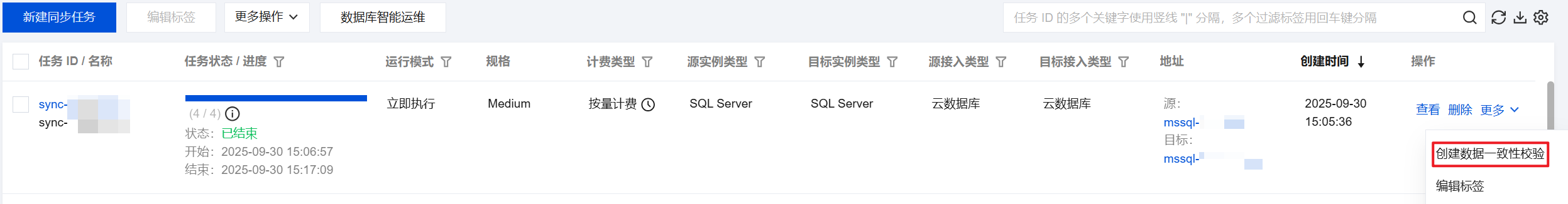 1. 登录 DTS 控制台,在左侧导航选择数据同步页,在任务列表找到目标任务,在其操作列单击更多 > 创建数据一致性校验。 说明: