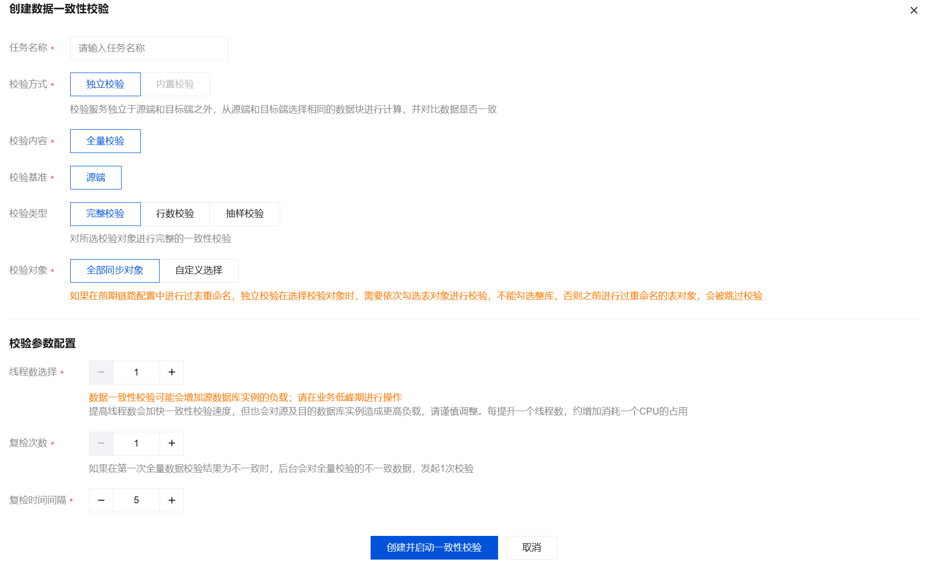 2. 在弹窗中,完成如下配置,单击创建并启动一致性校验。
