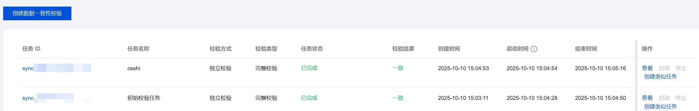您也可以在任务列表的操作列单击查看,或者直接单击任务 ID 进入任务详情页面,然后选择一致性校验页面,单击创建数据一致性校验。