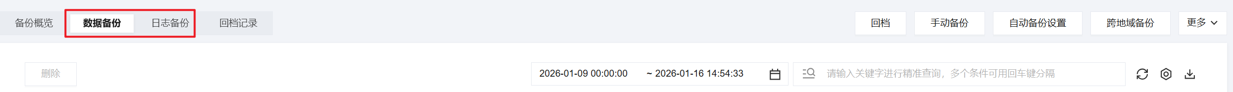 3. 在实例管理页,选择备份管理页,可在数据备份页签或日志备份页签查看对应备份文件。