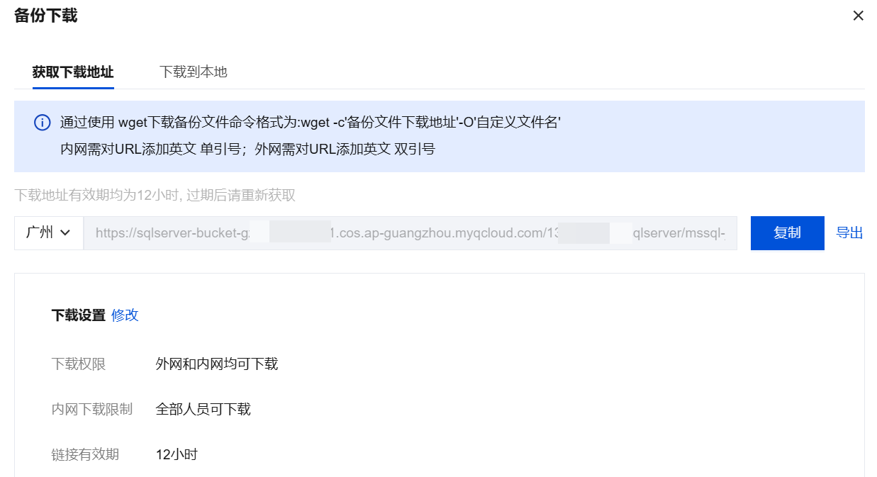 云数据库 SQL Server 控制台提供备份的文件列表,并可以通过内网和外网地址下载备份文件,通过下载的备份文件可将数据库恢复到其他数据库(如自建数据库)。本文为您介绍如何通过控制台下载备份(包含本地备份及跨地域备份)。
