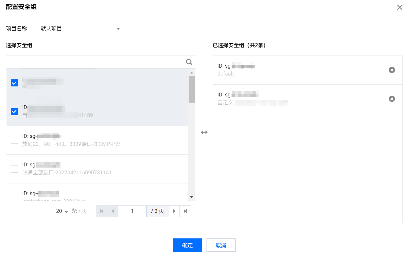 6. 在弹出的配置安全组的对话框,选择已创建的安全组,可根据项目名称搜索过滤安全组。