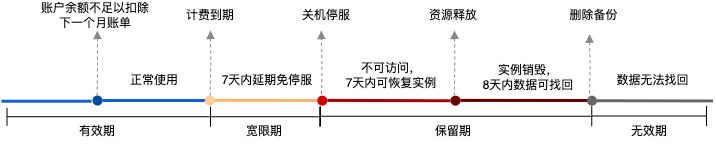 无效期 | 关机15天之后 | 云数据库资源被彻底销毁,所有数据已被删除,且不可找回。 |