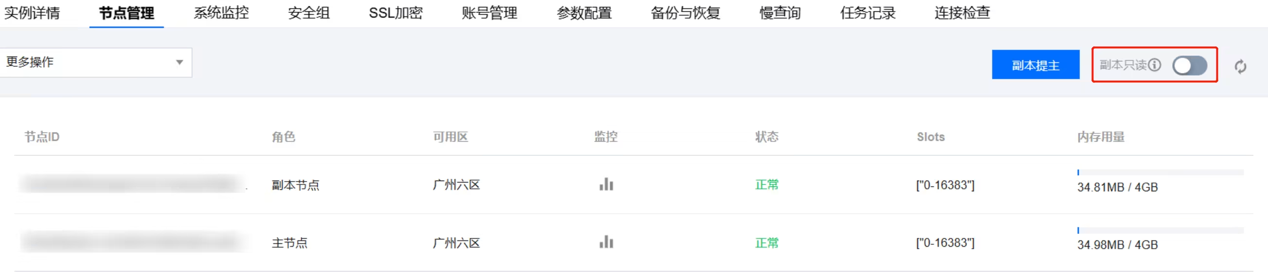 控制台:在节点管理页面,可操作开启读写分离的功能。具体操作,请参见 副本只读。