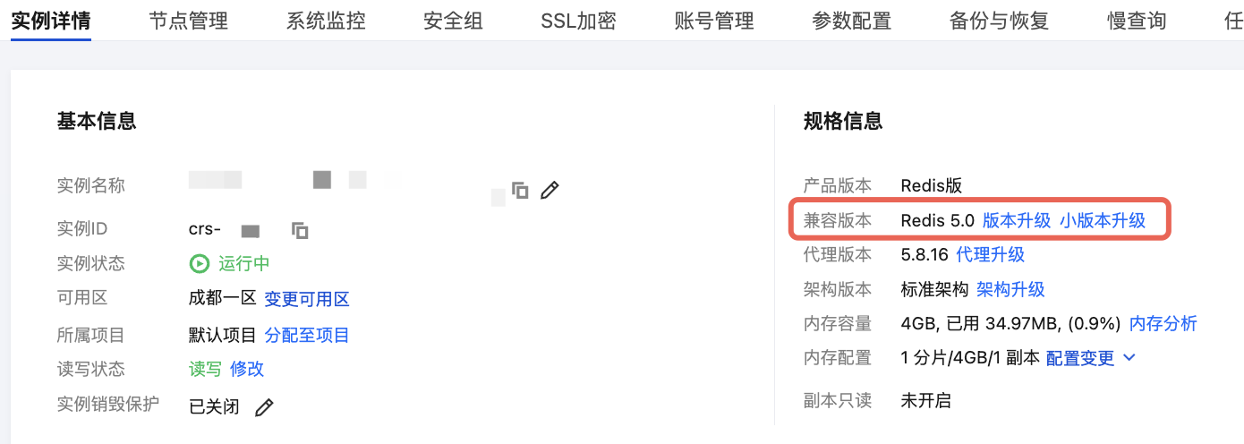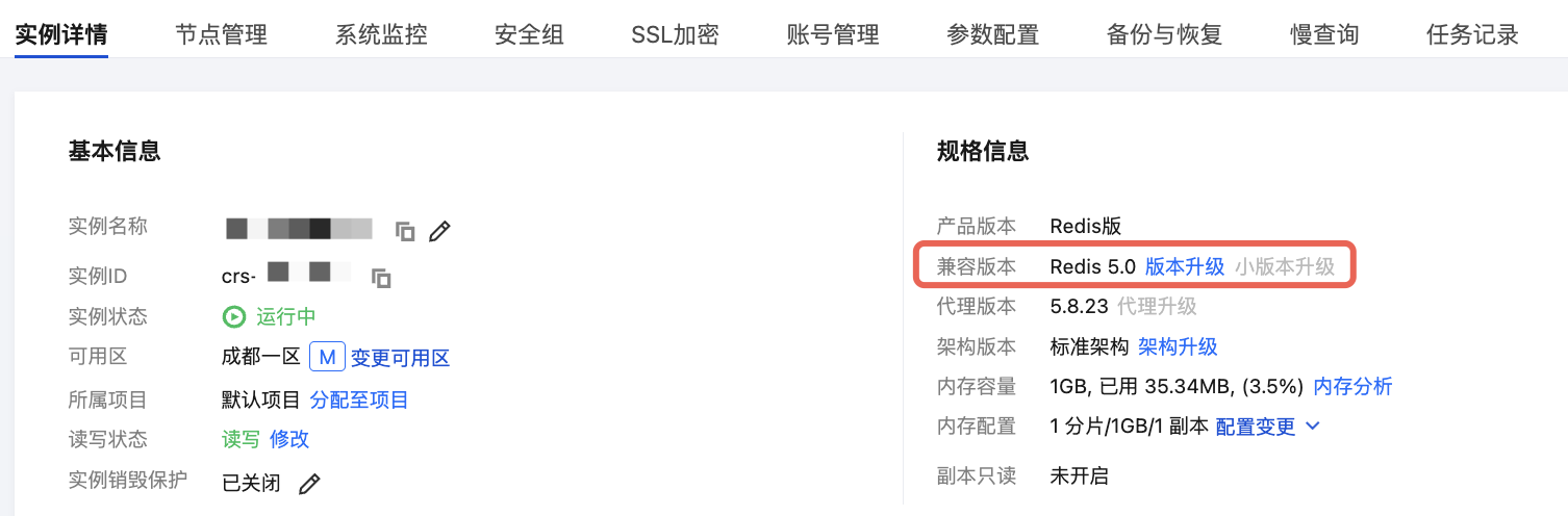 兼容版本 | 待升级实例当前兼容 Redis 的版本。 |