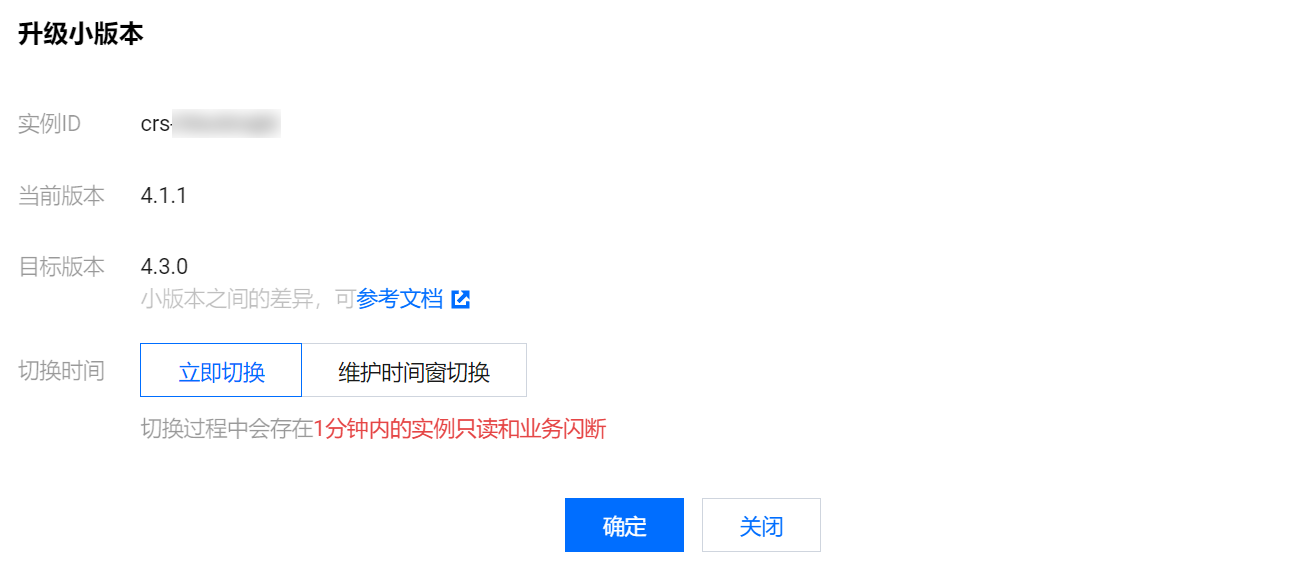 切换时间 | 立即切换:数据同步接近完成(需同步的数据 < 10MB),执行切换动作。 维护时间窗切换:在实例的维护时间窗内,执行切换动作,如果在当前维护时间窗无法满足切换条件,将在下一次维护时间窗进行切换尝试。维护时间可在实例详情页的维护时间窗处修改。 |