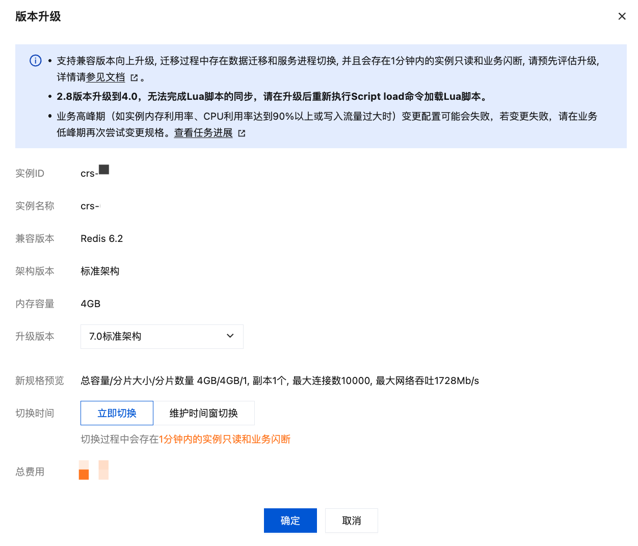 总费用 | 升级实例,不涉及计费变更。 |