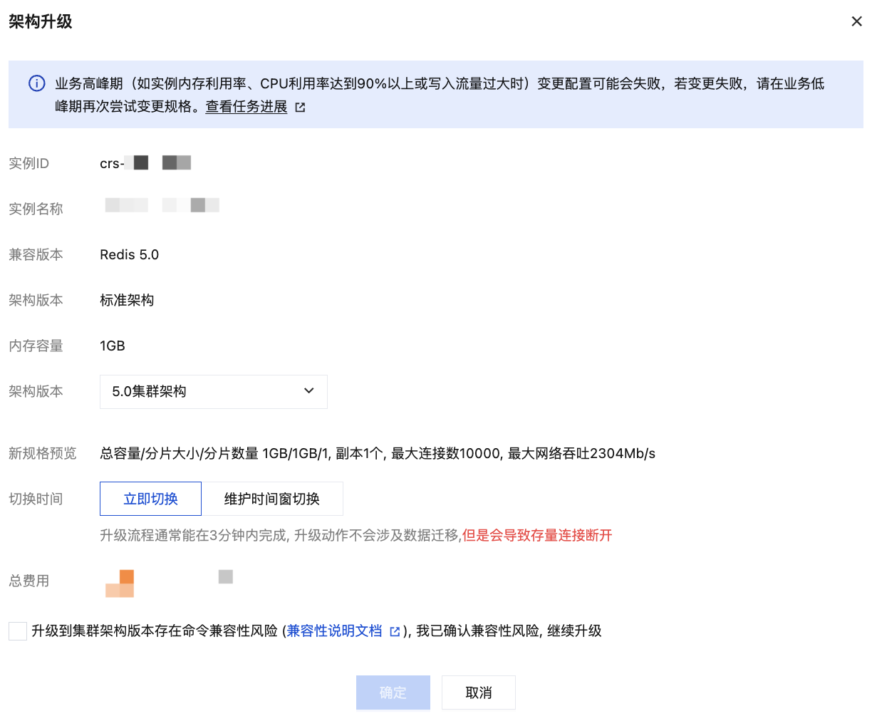 总费用 | 升级架构之后的费用。 按量计费:实例升级架构之后每小时的计费单价。单击计费详情,可查看计费项目、计费公式,确认费用。 包年包月:实例升级架构后到期之前的总费用。 |