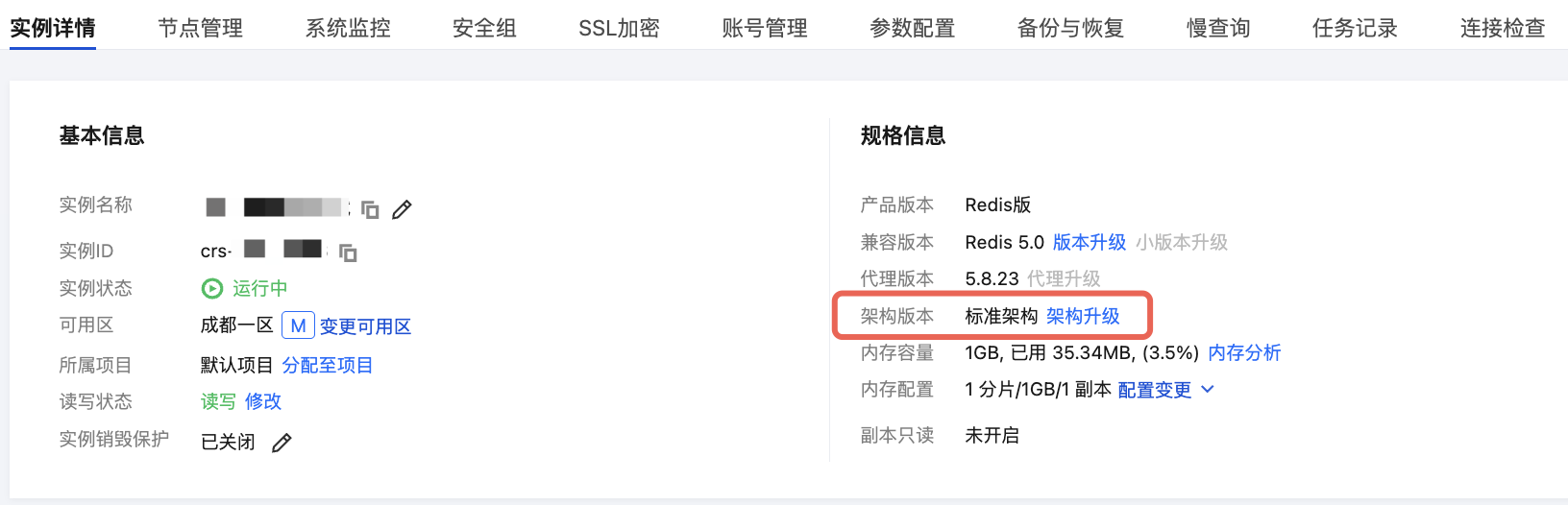 不支持跨版本架构升级 | 升级架构时不能同时升级版本。例如:不支持 Redis 4.0 标准架构 → Redis 5.0 集群架构。 如需同时升级版本和架构,请先完成版本升级,再进行架构升级。 |