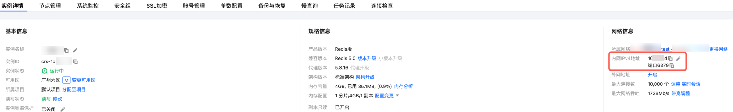 在 实例列表,单击实例 ID 进入管理页面,在实例详情页的网络信息区域,可以查看到实例的内网 IPv4 地址。 访问多可用区实例