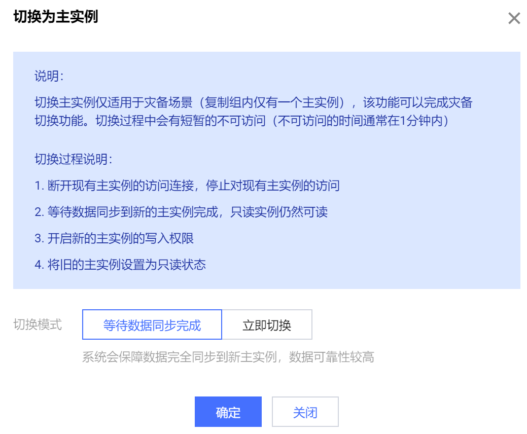 等待数据同步完成:以数据可靠性优先,仅当前主实例数据同步至切换后主实例,才执行切换操作。