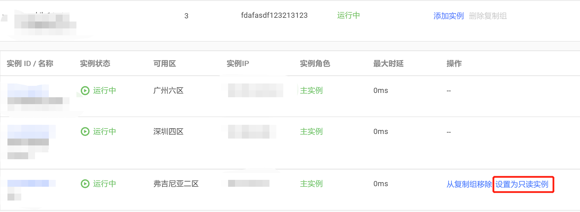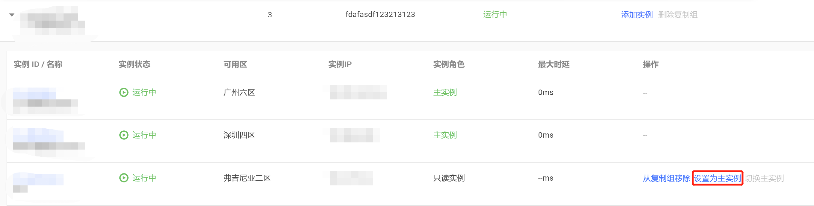 1. 在 复制组列表,单击复制组名称前面的,展开复制组中的实例列表。 2. 找到需设置为主实例的只读实例,在其操作列,单击设置为主实例。