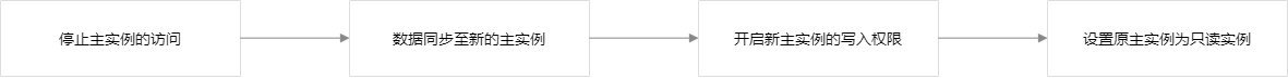 切换主实例仅适用于灾备场景,即复制组内仅有一个主实例,一个或多个只读实例,主实例与只读实例可以进行角色切换,切换过程中复制组会有短暂的不可访问,通常持续1分钟,切换过程如下图所示。