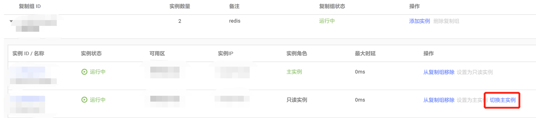 1. 在 复制组列表,单击复制组名称前面的,展开复制组中的实例列表。 2. 找到需切换主实例的一个只读实例,在其操作列,单击切换主实例。