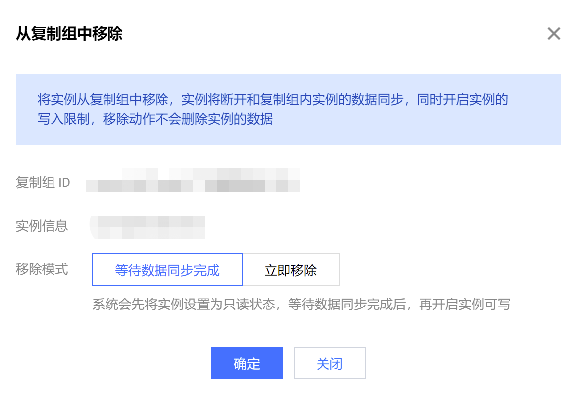 3. 在从复制组中移除对话框,确认移除的实例信息,单击确定。