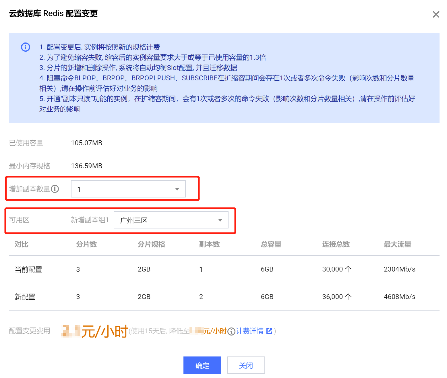 5. 在云数据库 Redis® 配置变更对话框, 在增加副本数量的下拉列表中选择所需新增的副本数量,在可用区的新增副本的下拉列表给副本指定可用区。具体参数解释,请见下表。