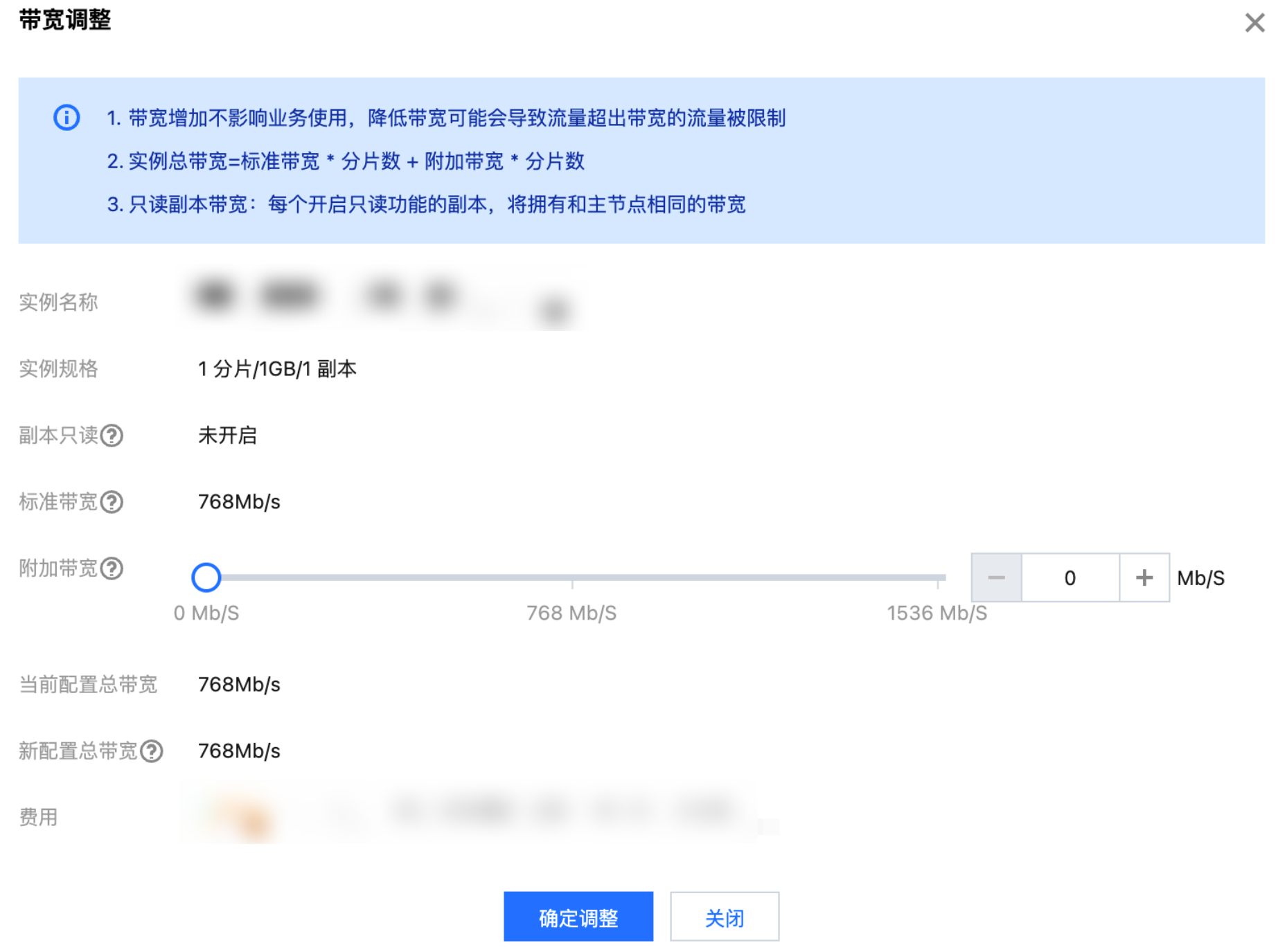 新配置总带宽 | 更新后实例的总带宽,可依据 计算带宽 的公式确认总带宽。 |