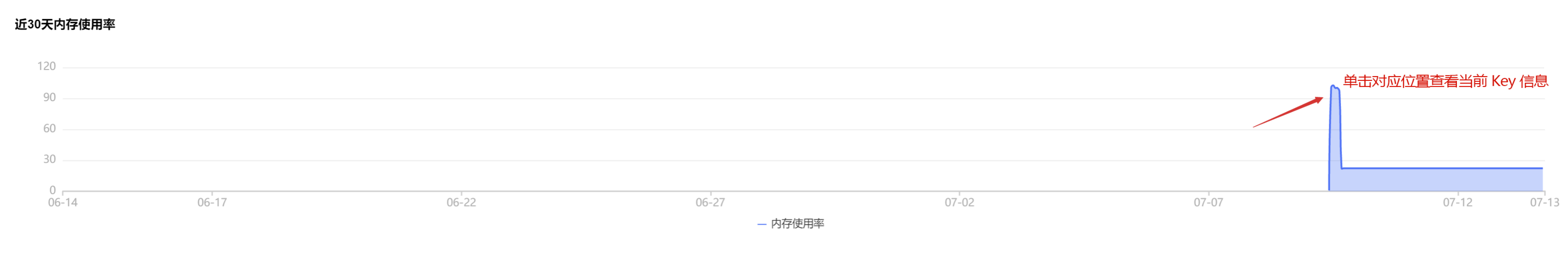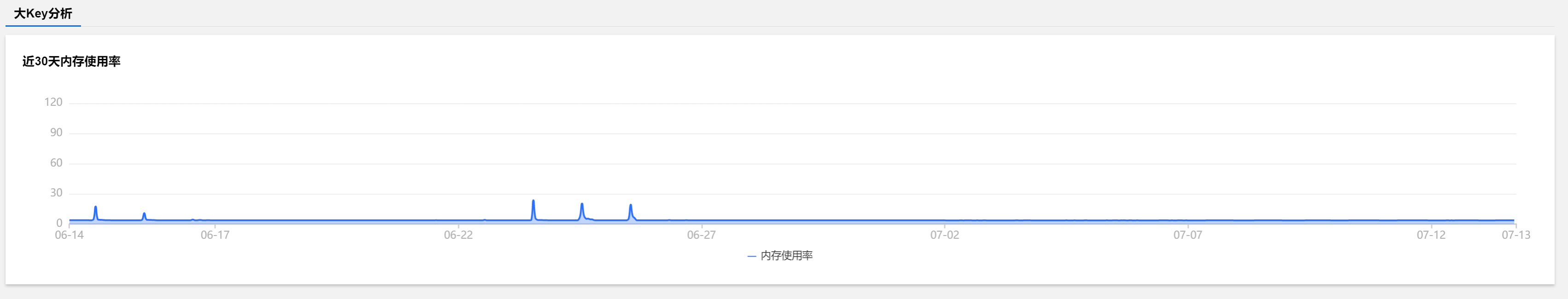 内存使用率大Key分析页面,默认展示近30天实例内存使用率的变化趋势。在时间轴选择某一时间段,可放大查看该时间区间内存使用率的变化趋势。