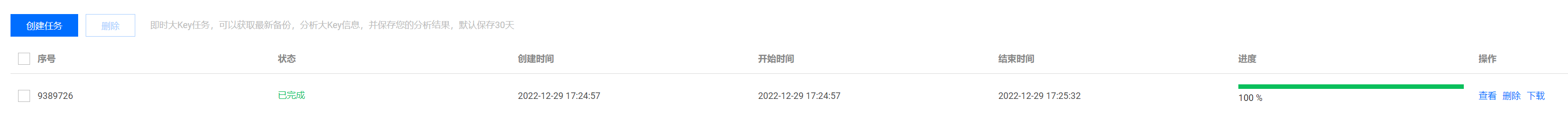 3. 分析结束后,单击操作列的查看,可查看大 Key 的分析结果。若经分析该大 Key 需要删除,可在任务列表的操作列,单击删除