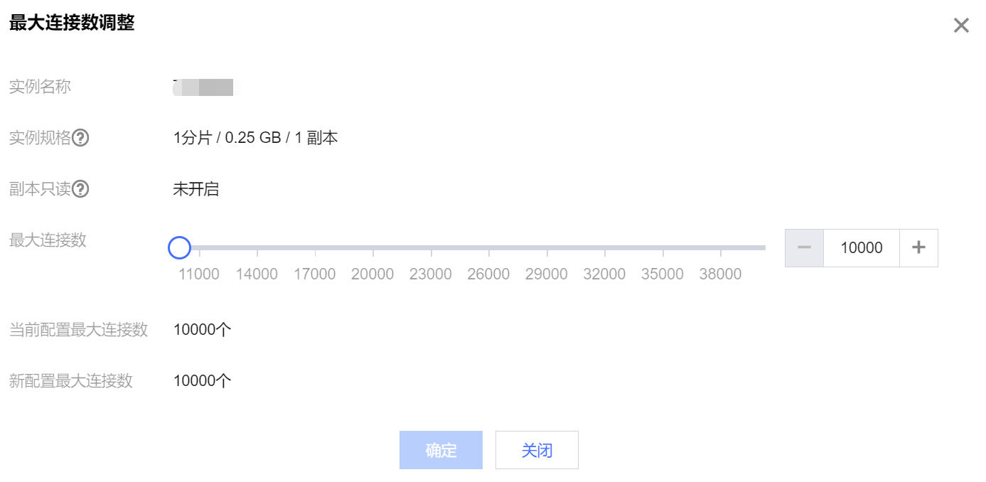 6. 在最大连接数调整对话框,确认实例信息及其规格,提升连接数。