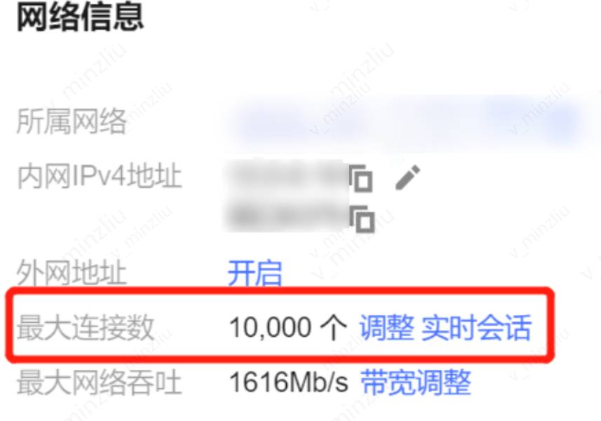 5. 在实例详情的网络信息区域,在最大连接数后面可查看到当前实例最大的连接数量,单击调整。