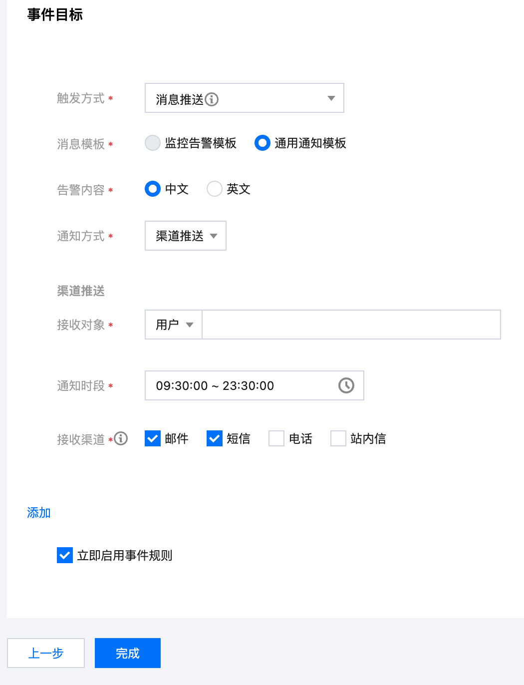 | 规则名称 | 设置事件规则的名称,只能包含字母、中文、数字、下划线、连字符,以字母/中文开头,以数字、字母或中文结尾,2~60个字符。 注意: 规则名称一旦创建无法修改。 |