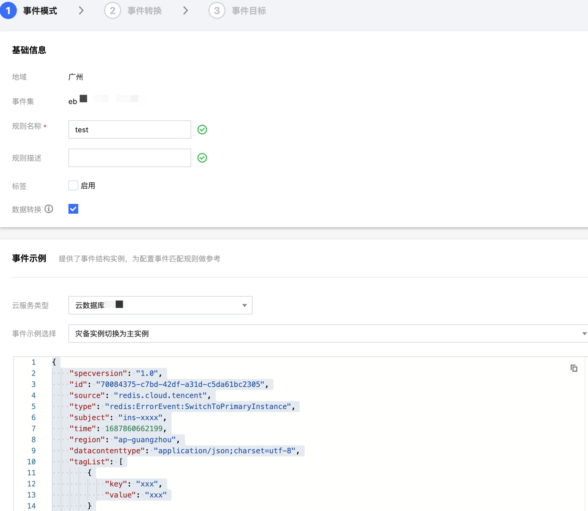 事件匹配 | 事件模式 | 表单模式:该模式可以选择云服务类型,及事件类型,给出事件匹配规则。 1.1 在此区域的云服务类型的下拉框中,选择云数据库 Redis。 1.2 在此区域的事件类型的下拉框中,选择具体的事件。 1.3 在匹配对象的下拉框,选择具体监控的实例。 1.4 在右侧事件匹配规则预览区域,将默认以JSON的语法格式生成事件规则。 1.5 单击测试匹配规则,可进行基本的语法检查;单击编辑匹配规则,可按需调整。 自定义事件:自定义编写事件匹配规则。 |