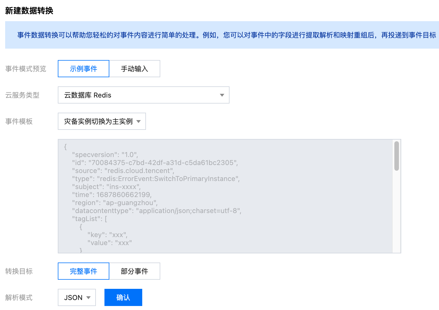 事件模式预览 | 选择示例事件,可使用事件模板进行数据转换。 选择手动输入,可在下方的输入框自定义事件字段。 |