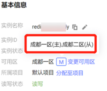 当前实例可用区预变更,需进行数据迁移。具体操作,请参见以下步骤,建议在 维护时间窗 内进行。 1. 将当前单可用区部署的实例升级为多可用区部署,并将主从节点分别指定在不同的可用区。具体操作,请参见 变更可用区。 升级为多可用区之后,在实例列表的可用区列,或者实例详情页面的基本信息区域,可查看到该实例可用区信息旁边带有图标。 将鼠标放在上,可查看当前实例主从节点的可用区信息已变化。 2.2 在实例列表,找到目标实例,单击其实例 ID。