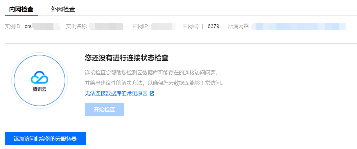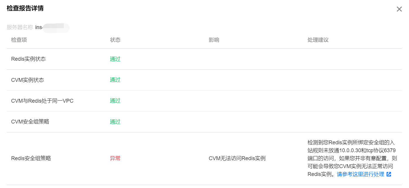 Redis 安全组策略 | 异常 | CVM 无法访问 Redis 实例 | 检测到您 Redis 所绑定安全组的入站规则未放通对 CVM 内网 IP 和端口的访问。 | 1. 登录 CVM 的控制台,在实例列表的主 IPv4地址列,确认连接 Redis 的 CVM 的内网 IP 地址。具体操作,请参见 查看 CVM 实例信息。 2. 请在 腾讯云分布式缓存数据库控制台 的安全组页签的规则预览区域,确认入站规则,具体操作,请参见 给数据库实例配置安全组。 |