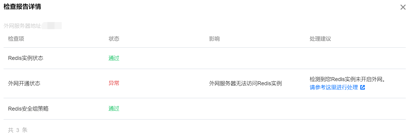 检测到您 Redis 实例所绑定的安全组入站规则未放通1.1.1.1和 TCP 协议6379端口的访问,如果您并非有意配置,则可能会导致您外网服务器无法正常访问 Redis 实例。 | 说明: 外网访问开通后将受到安全组网络访问策略的控制,请在安全组入站规则中配置访问数据库的来源信息,并放通协议端口(需同时放开内网和外网端口,内网端口默认为6379)。 |