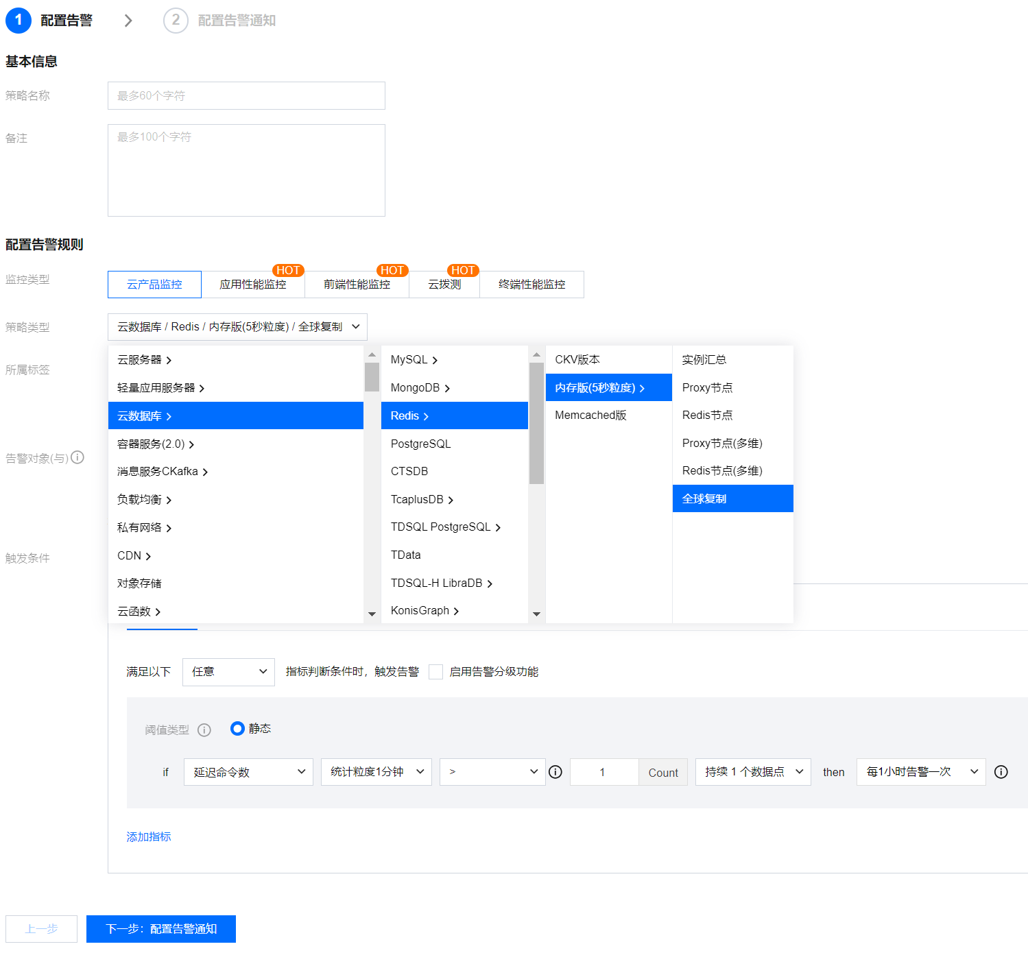 策略类型 | 请选择云数据库 / Redis / 内存版(5秒粒度)/全球复制。 |