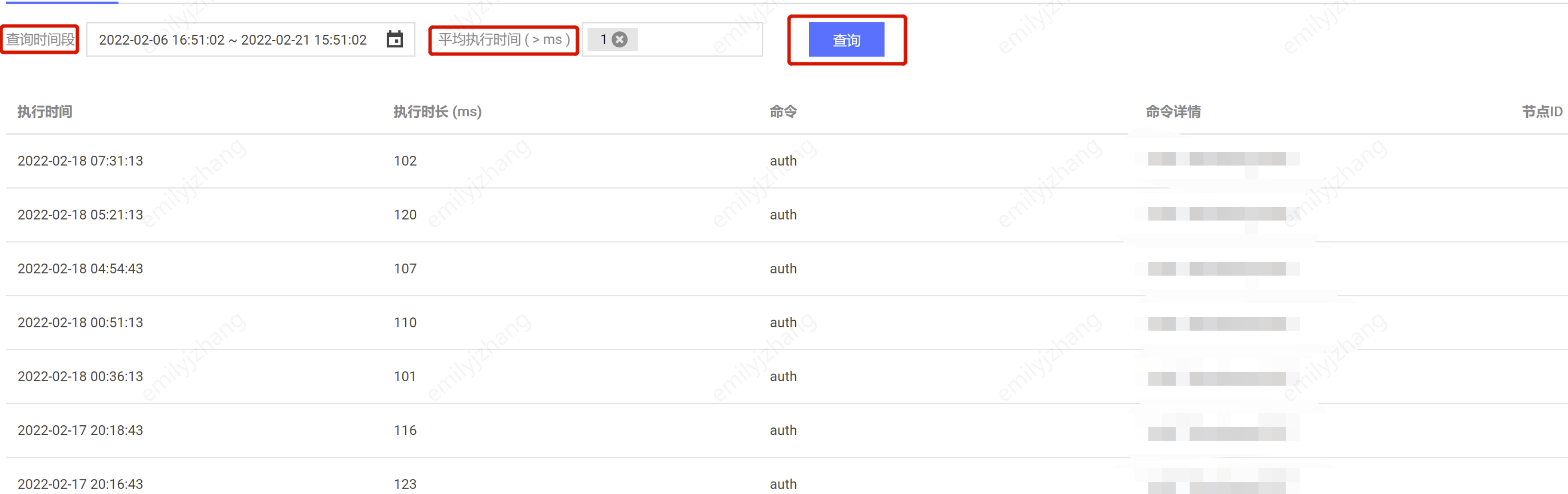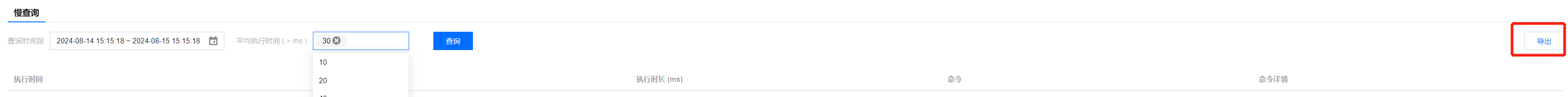 5. 单击慢查询页签,在查询时间段后面选择时间范围,在平均执行时间后面的下拉列表选择命令请求超出时长的阈值,单击查询,则显示该时间范围内执行慢查询的记录。