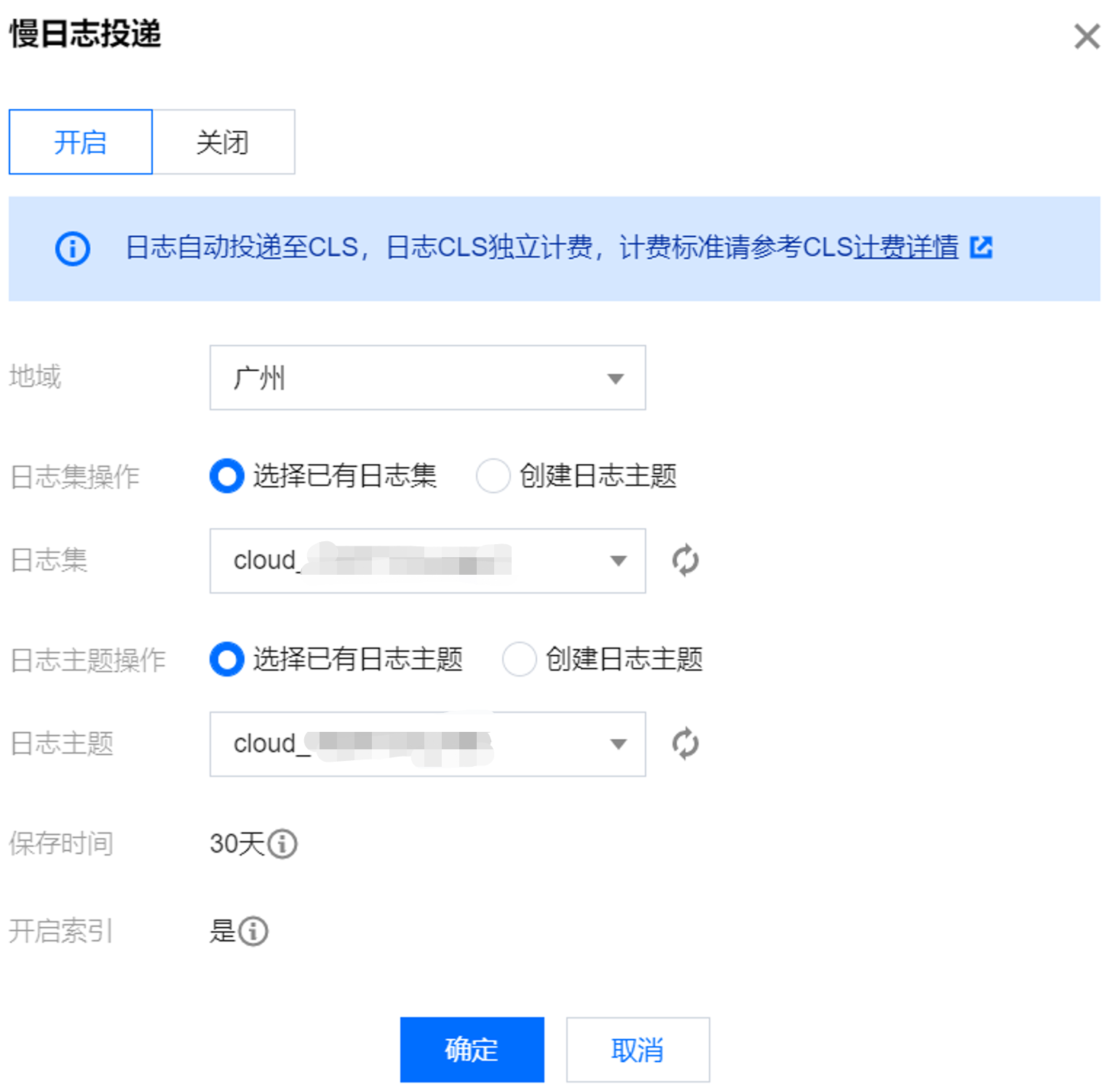 保存时间 | 选择慢日志投递数据的保存时间,默认为30天。支持选择1天-3600天,日志过期后将自动清除数据。 若日志主题选择了已有的日志主题,则保存时间会默认和对应已有的日志主题保存时间一致。 将鼠标放在 ![]() | 30 |