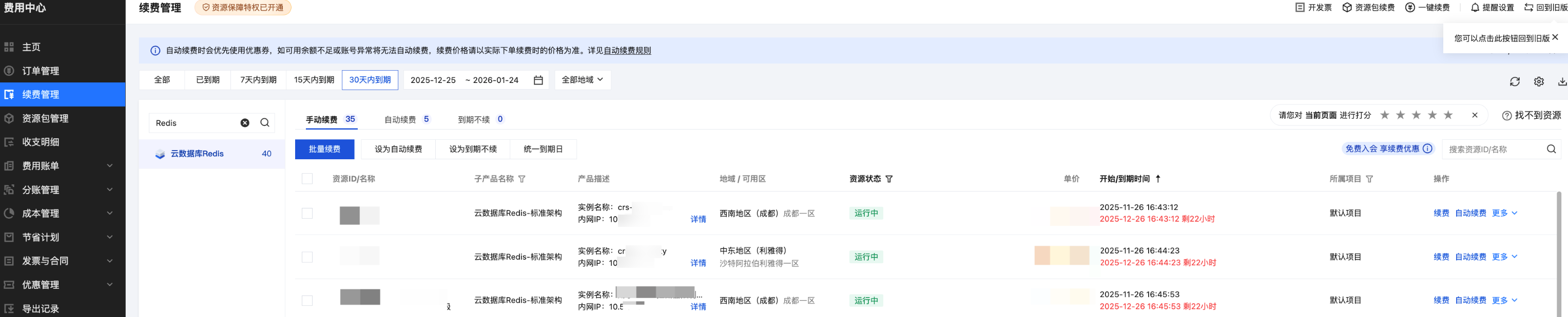 2. 在 续费管理 页面,搜索云数据库 Redis,可分别查询账户下已到期、7天内到期、15天内到期、30天内到期的 Redis 实例。如下图所示。可对实例资源进行统一续费管理。具体操作,请参见 续费管理。 相关 API