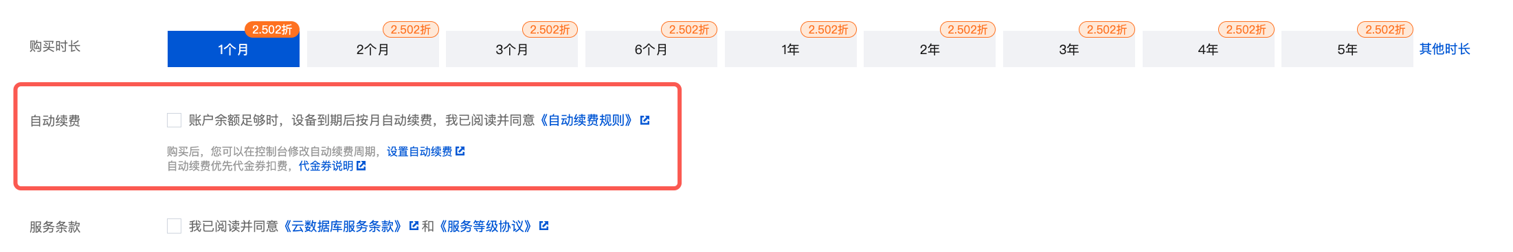 在续费时长,选择实例需续费的时长,按整月或整年选择。