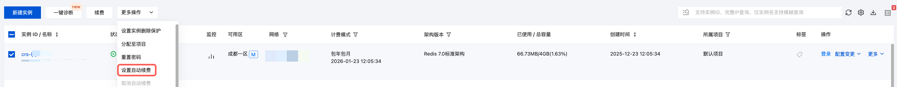 4. 在列表上方,选择更多操作 > 设置自动续费。