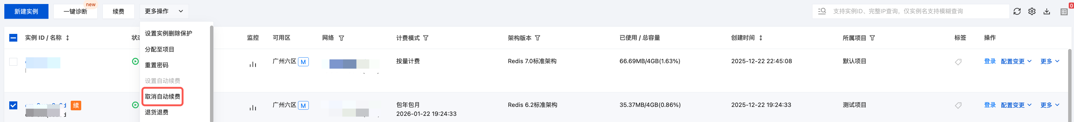 4. 在列表上方,选择更多操作 > 取消自动续费。